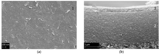 To understand the inorganic matrix material, its permeating properties as a single layer were investigated. Figure 5 displays SEM images of an organo–silica membrane in a cross-section with the surface visible in the upper part. Three distinct layers are visible. In the insert, the organo–silica top layer 4 is shown, with a thickness of about 100 nm and a defect-free, smooth surface.