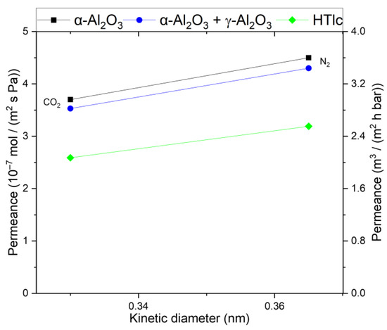Single-gas permeation experiments were conducted with CO2 and N2 to determine the permeation kinetics (see Figure 6). The organo–silica layer deposited on the top of the γ-Al2O3 layer shows different permeation behavior compared to the other membranes. While both gases traverse micropores, surface diffusion emerges as the predominant mass transport mechanism. N2 can solely diffuse through the free pore volume because its adsorptive interactions are neglectable. The permeance decreases to approximately ~0.1 × 10−7 mol m−2 s−1 Pa−1 at room temperature. CO2, having an additional diffusion path along the inner pore surface, undergoes a smaller decrease, resulting in a permeance of around ~1.3 × 10−7 mol m−2 s−1 Pa−1. Consequently, the ideal selectivity reaches 13.