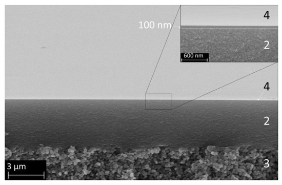 SEM image of the microporous organo–silica top layer (4) on top of the γ-Al2O3 layer (2) and the α-Al2O3 support (3). The insert shows the same membrane at a higher magnification for better visualization of the organo–silica layer thickness.