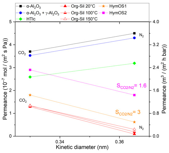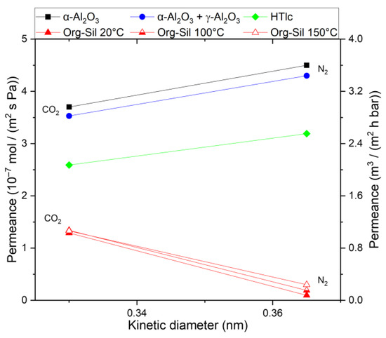As temperature rises during organo–silica measurements, two distinct behaviors become apparent. Firstly, the permeance for CO2 appears to remain unaffected. As temperature increases, activated permeation rises, while surface diffusion, which relies on active adsorption sites, decreases [18]. These two mass transport mechanisms seem to counterbalance each other for this pore size in the case of CO2, resulting in a relatively consistent permeance as temperature rises. Secondly, the permeance for N2 increases. With increasing temperature, more of the required activation energy is provided for the activated permeation in ultramicropores. Surface diffusion does not participate in the overall N2 transport; thus, no observable decrease, as in the case of CO2, counters the increase. A comprehensive description of activated permeation can be found in the study conducted by Lange et al. [19]. Overall, because of the increasing N2 permeance, the selectivity diminishes to 4.3 at 150 °C.