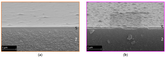 SEM secondary electron images of the HymOS1 membrane (5) on top of the γ-Al2O3 layer (2) (a) with a low hydrotalcite concentration and (b) the HymOS2 membrane with a higher concentration.