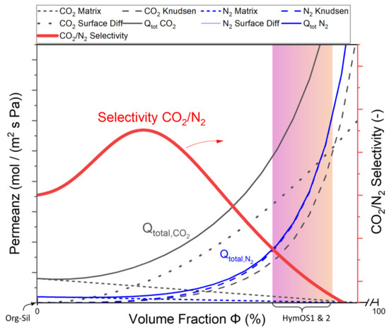 Visualization of the total MMM permeance described in Equation (2) for CO2 (black) and Equation (3) for N2 (blue) as a function of the added HTlc content (only the part for low volume fractions is shown here). The total permeance and the permeances for different mass transport mechanisms that comprise the total permeance are given in dark for CO2 and blue for N2. The resulting selectivity is shown in red. The prepared membranes HymOS1 and 2 lie within in the marked area.