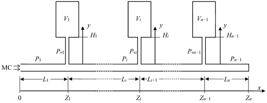 Figure 1 presents a generalized representation of a multiple-tank downstream receiver of a CV system. n − 1 cylindrical tanks are connected to the straight mainline (x-direction) of length Zn via n − 1 perpendicular connecting tubes located at different distances (Zi) from the membrane cell. The connecting tubes divide the mainline into n segments (parts). The tubes in the mainline may have different lengths (Li) but have the same internal diameter. The tanks may have different volumes (Vi). Although not shown in Figure 1, each tank can be included or excluded from the downstream volume by respective valves at the entrance to each tank. The distance (Hi) of the tank from the main line, i.e., the length of the connecting tubes, can be different, but all connecting tubes have the same internal diameter. The diameter of the mainline tubes can differ from that of the connecting tubes. At any time, the pressures pi in the mainline tubes and pvi in the connecting tubes depend on the distances x and y from the entrance to the respective tubes.