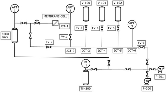 Figure 2 presents a schematic diagram of the CV system used in this study. After installing the membrane inside the cell, the system was extensively evacuated to degas the membrane using a rotary vacuum pump P-200 (CANVACTECH, Ottawa, ON, Canada, Edwards RV3, A65201906, ultimate pressure: 1.5 × 10−3 Torr) and a turbomolecular pump P-201 (Edwards Vacuum LLC Sanborn, New York, NY, USA, Edwards TS85D1002, ultimate pressure < 3.75 × 10−10 Torr). A freshly installed membrane required five days until degassing could no longer be detected. Between the tests, one day of evacuation was sufficient for complete degassing. Before each experiment, a leak test was performed when the system was at a high vacuum, 10−4 Pa. The leak rate, determined from the pressure rise recorded by two identical 10-Torr absolute pressure transducers APT2 and APT3 (CCR Process Products Kanata, Ontario, Canada, MKS627F11TBC1B, 10−5 full-scale resolution, accuracy: 0.12% of reading, range: 0 to 10 Torr), never exceeded 8.1 × 10−8 Pa/s. The system was pressurized to 1600 Torr using a nitrogen gas cylinder TK-200 (99.998% purity, Linde Mississauga, ON, Canada), and the upstream pressure was monitored with the absolute pressure transducer APT1 (CCR Process Products Kanata, ON, Canada, MKS627F13TBC1B, 10−5 full-scale resolution, accuracy: 0.12% of reading, range: 0 to 2000 Torr). The FV valves in Figure 1 were manually operated stainless steel bellow sealed valves (Swagelok SC-4BK-VCR). They were procured from Weston Valve & Fitting LTD, Mississauga, ON (Canada). With FV-2 closed (i.e., the upstream and downstream volumes separated), the time-lag experiments were initiated by opening the valve separating the membrane cell from the upstream volume.