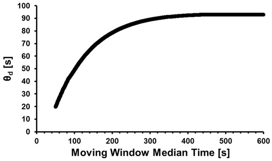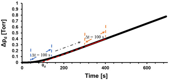 The time lag (θ) is commonly determined from the intercept of the extrapolated linear portion of the pressure response with the time axis. Because of gas accumulation downstream from the membrane, the actual steady-state conditions are never reached, and what appears as a linear pressure response signifies pseudo-steady-state conditions. Consequently, the value of θ depends on the selection of the range of the pressure response data. In this study, we used the concept of a moving window to avoid the ambiguity associated with commonly determined θ values [13]. This concept is demonstrated in Figure 3. The moving window in Figure 3 has a fixed size of 100 s and contains approximately 1700 data points. A linear regression of pressure response within the window’s bounds (solid red line) is extrapolated to the time axis (dashed red line), and the resulting intercept represents an instantaneous time lag (θd) for the time from the middle of the window. The window is then shifted one datum at a time, and the new θd is obtained. Plotting such determined instantaneous time lag values versus time yields Figure 4.