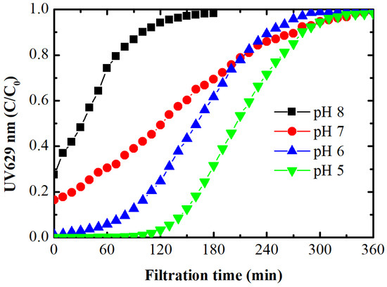 Dead-end filtration of the dye feed solution without applied potential at different pH values is shown in Figure 3. The EC PAN-EDA membrane exhibited dye adsorption, as indicated by normalized UV629. The membrane is positively charged at pH < 7.8 ± 0.2, and intrinsic membrane charge increases with decreasing pH due to the protonation of amine groups (-NH2) in EDA to cationic form (-NH3+) to a greater extent under slight acid conditions [41]. The recorded zeta potential of the membrane was 3.7 mV ± 2.5 at pH 7, 5.2 mV ± 1.8 at pH 6, and 9.2 mV ± 2.6 at pH 5 [15]. Hence, this removal was mainly due to the electrostatic attraction of negatively charged dye to the positively charged amine, which is present in the EC PAN-EDA membrane structure. This dye rejection by size exclusion is improbable because the size of the used dye falls within the range of 1 to 2 nm, which is nearly one order of magnitude smaller than the pore size of the membrane used. In our studies, analogous adsorption mechanisms were observed for NOM and heavy metal anions like arsenate (AsO43−) and chromate (CrO42−) [30,31].