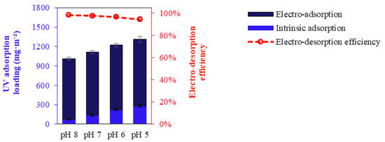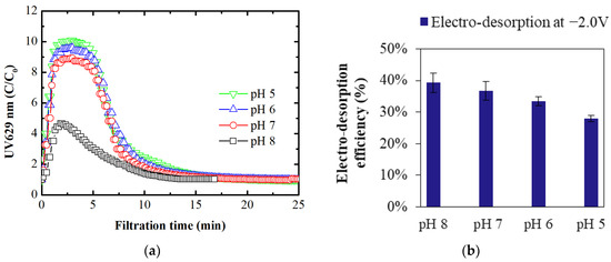 (a) UV absorbance curves depicting electro-desorption; (b) electro-desorption efficiency at different feed water pHs. A feed solution containing 2.5 mg/L BB dye at an ionic strength of 1 mM was used for electro-desorption.