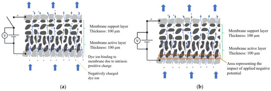 The MPB model was employed to elucidate the electro-desorption process of intrinsically adsorbed BB dye. Model simulations at −2.0 V indicated a rapid drop in electrical potential within the porous membrane depth, diminishing at approximately 23.5 nm (Figure 6a). These model simulations are consistent with previous experimental results reported by Jing et al. [32]. This drastic potential drop with depth into the porous membrane active layer can be attributed to membrane pores, specific solution resistance, and applied external potentials [19,32].
