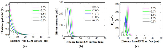 The MPB model was exercised to provide qualitative insights into the observed experimental results on electro-adsorption. The simulations included the electrical potential profiles, BB concentration along the ECM surface, and electrostatic attractive force as a function of applied membrane potential and distance from the membrane surface (Figure 9). As expected, as the distance from the membrane surface increases, the potential decreases for all applied positive potentials. The concentration of negatively charged dye along the membrane surface reached a maximum of approximately 255 mM. The maximum concentration is a function of the finite volume of BB ions that can accumulate or fit on the charged surface [22].