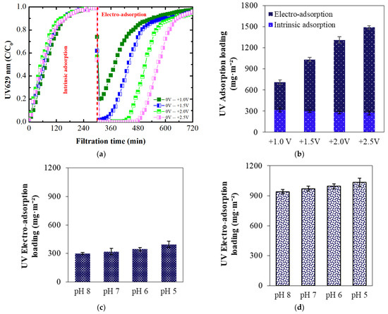 (a) BB dye intrinsic adsorption followed by electro-adsorption at pH 5; (b) UV intrinsic and electro-adsorption loadings at pH 5; and electro-adsorption loadings at (c) +1.0 V and (d) at +2.0 V.
