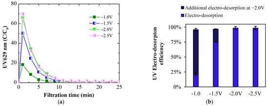 The electrofiltration experiments for in situ membrane regeneration were conducted by applying a negative electrical potential to the membrane working electrode (membrane electrode as cathode). The aim was to evaluate the electro-desorption process for intrinsically adsorbed organic molecules. The same feed solution used for intrinsic and electro-adsorption experiments (2.5 mg/L BB dye) was pumped during electro-desorption experiments. The obtained UV629 absorbance curves depicting electro-desorption are shown in Figure 5a.