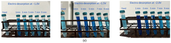 For these electro-desorption experiments, a feed solution containing 2.5 mg/L of BB dye at pH 8 and 1 mM ionic strength, which was the same concentration used in the initial dye adsorption experiments, was used. The UV629 absorbance curves illustrating the extent and rate of electro-desorption are shown in Figure 11a. These curves provide insights into desorption dynamics and the optimal conditions for membrane regeneration. At the lowest cell potential of −1.0 V, the electro-desorption peak appearing at 1 min was the lowest, resulting in an electro-desorption efficiency of 21.3% (Figure 11b). Following −1.0 V, −2.0 V was applied to desorb additional dye with stronger electrostatic repulsion (UV data presented in Figure 11b as additional electro-desorption at −2.0 V), resulting in an overall desorption efficiency of 95.8%. At −1.5 V, the electro-desorption efficiency improved to 75.1%. Subsequent additional dye desorption at −2.0 V following −1.5 V further increased the efficiency to 96.8%. Under electro-desorption conditions at −2.0 V, the C/C₀ peak reached 65.8, achieving an electro-desorption efficiency of 98.5% (Figure 11b). At −2.5 V, the electro-desorption peak was slightly greater than at −2.0 V, but the electro-desorption efficiency remained at 98.4%. The visual appearance of the desorbate at −1.0 V, −1.5 V, and −2.0 V is depicted in Figure 11c, showing a noticeable increase in blue color intensity as the applied negative potential increases. By 9 min, the color of the desorbate closely matches that of the feed color.