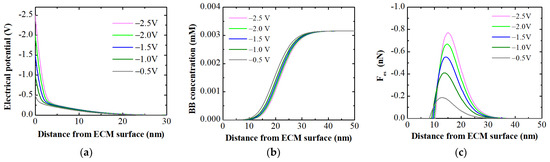 After obtaining the electrical potential profiles away from the ECM surface, Equation (6) was employed to compute the concentration of individual ions as a function of distance from the membrane surface [20].