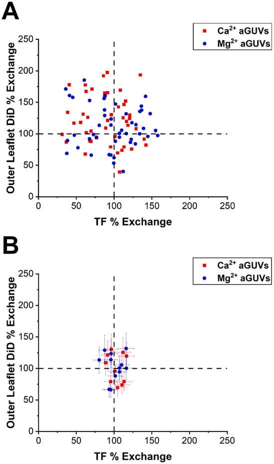 Correlation between DID and TF-PS outer leaflet exchange. (A) Outer leaflet DiD % exchange vs. TF % exchange for Ca2+- and Mg2+-formed aGUVs. aGUVs contain 100 mM sucrose, 100 mM NaCl, 50 mM KCl, 25 mM HEPES, pH = 7.4 and are imaged in 4 mM CaCl2 (or MgCl2), 6 mM Na2EDTA, 100 mM NaCl, 84 mM KCl, 2 mM sucrose, 25 mM HEPES, pH = 7.4. Error bars are omitted for clarity. (B) Same plot as in panel (A), but after removing all range-failing aGUVs. Error bars are calculated via a propagation of uncertainty using standard deviations.