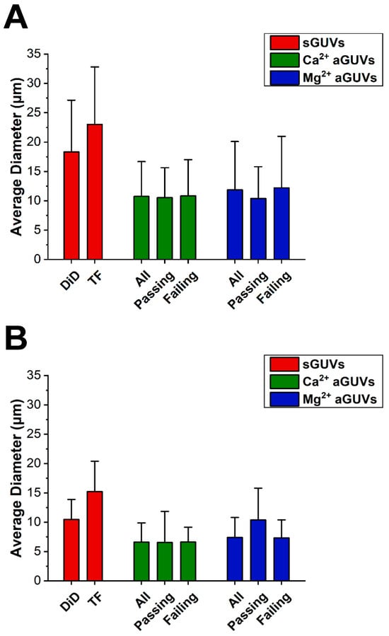 Diameter comparisons between sGUVs and aGUVs. (A) Average diameter of all Ca2+- and Mg2+-formed aGUVs, those that are range-passing, and those that are range-failing compared to that of sGUVs whose compositions match the theoretical inner leaflet composition (DiD sGUVs) or theoretical outer leaflet composition (TF sGUVs) of the aGUVs. Error bars show standard deviations. All vesicles contain 200 mM sucrose, 5 mM HEPES, pH 7.4. sGUVs are imaged in 200 mM glucose, 5 mM HEPES, pH = 7.4. aGUVs are measured in low-salt buffer with a final composition of 4 mM CaCl2 (or MgCl2), 6 mM Na2EDTA, 49 mM NaCl, 34 mM KCl, 5 mM sucrose, 25 mM HEPES, pH = 7.4. (B) Same as panel (A), but for vesicles in physiological ionic strength salt buffer. All vesicles contain 100 mM sucrose, 100 mM NaCl, 50 mM KCl, 25 mM HEPES, pH = 7.4. sGUVs are imaged in an isotonic glucose buffer of equal ionic strength and pH. aGUVs are imaged in 4 mM CaCl2 (or MgCl2), 6 mM Na2EDTA, 100 mM NaCl, 84 mM KCl, 2 mM sucrose, 25 mM HEPES, pH = 7.4. “DiD” sGUV: DOPC/DID 99.9/0.1 mol%; “TF” sGUV: DOPC/POPS/TF-PS 69.9/30/0.1 mol%.