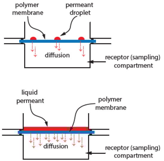 Simplified diffusion cell diagram depicting chemical permeant placed as droplets (top) or as flooded cell (bottom).