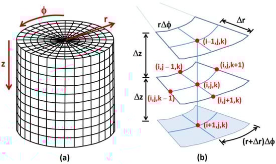 Equation (1) was discretized into a sufficiently large number of mesh points to generate small three-dimensional elements as shown in Figure 2b to achieve mesh independence. The discretized equation for a central mesh point is given in Equation (2) in its explicit form.