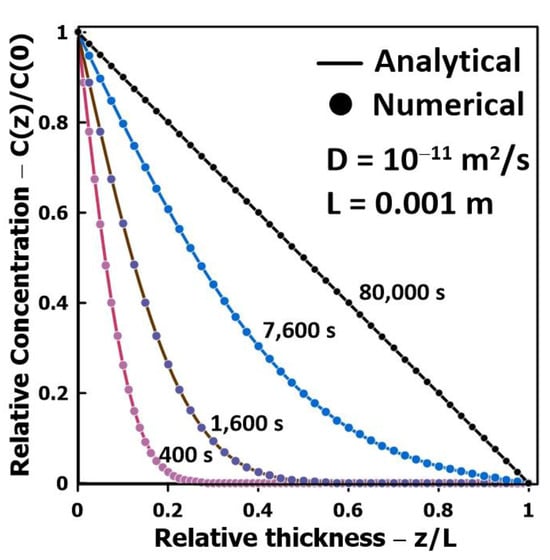 Before presenting the results of various numerical simulations, it is important to examine the accuracy of the numerical model with a known benchmark solution. Figure 4 shows the comparison between the analytical and numerical solutions for the case where the feed side of the membrane is completely flooded at time t = 0. It is the only benchmark solution that is available for this problem, which is reduced in this case to a one-dimensional solution. Equation (13) gives the analytical solution of the concentration profile c(z,t) throughout the membrane as a function of time (t) and relative membrane thickness (z/L) for this case study. This analytical solution was obtained by the method of separation of variables []. The results of Figure 4 clearly show that the numerical solution for the concentration profile as a function of time corresponds exactly to the analytical concentration profile. An overall mass balance evaluated the accuracy of the simulations in the case of the partial liquid coverage of the membrane. In all cases, the overall mass balance was shown to be very accurate.