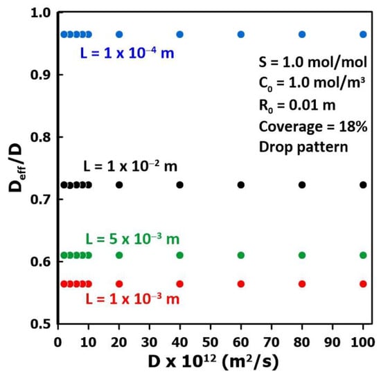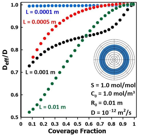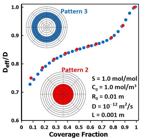Figure 10 shows a comparison of the relative diffusivity varying with the fractional coverage of the membrane surface for pattern 3 and four different membrane thicknesses. The results of Figure 10 clearly show the effects of both the coverage fraction and the membrane thickness for a constant coverage pattern. The value of the relative diffusivity Deff/D asymptotically tends to unity in all cases when the fraction coverage of the membrane surface area approaches unity, that is a flooded cell (pattern 1). These results corroborate the work of Rivin et al. [] who state that the “flooded cell” scenario is the ideal method to estimate the intrinsic diffusivity of the membrane, as it corresponds to the case of one-dimensional diffusion.