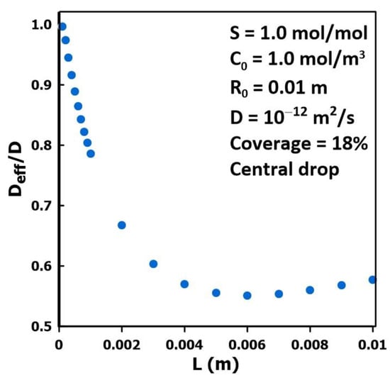 The diffusivity ratio (Deff/D) as a function of the membrane thickness for a central liquid drop (pattern 2) covering 18% of the membrane surface.