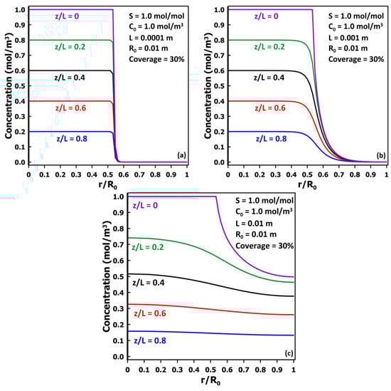 To explore the reason for the observed minimum in the diffusivity ratio and its subsequent increase as the thickness increases, the radial concentration profiles under steady state were obtained at five different relative depths (z/L) within the membrane and are presented in Figure 7. These results were obtained for a centered droplet covering 30% of the membrane surface area. Figure 7a presents the concentration profiles for a very thin membrane, L = 100 µm, showing very negligible radial diffusion such that the inlet and exit permeation areas are nearly identical with a flat concentration profile. The membrane diffusivity is very well estimated, with a ratio of Deff/D of 0.984. In Figure 7b, a larger radial diffusion was observed for a membrane having a thickness ten times larger (1.0 mm), which delayed the attainment of the steady state and the time lag. As a result, the estimated diffusion coefficient is smaller than the actual diffusion coefficient with a diffusivity ratio Deff/D of 0.809. When the membrane thickness is yet ten times larger (10 mm) and equal to the radius of the membrane, the migrating species have a significantly larger radial diffusion as shown in Figure 7c. The thickness is sufficiently large for the migrating species to diffuse to the impermeable diffusion cell boundary. As a result, a nearly flat concentration profile is observed close to the permeate side of the membrane. The estimated diffusion coefficient is smaller than the actual diffusion coefficient with a diffusivity ratio Deff/D of 0.643. This data point for this relatively thick membrane is in the increasing portion of the Deff/D versus L plot and further increasing the membrane thickness, although unrealistic, would lead to a relative diffusivity even closer to the actual diffusivity as a larger relative portion of the membrane reaches a flat concentration profile.