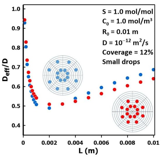 Figure 8 presents the results of the series of simulations performed to examine the variation in the relative diffusivity as a function of the thickness for two different drop patterns covering 12% of the surface membrane area. The droplet diameter, the diffusivity, and the number of droplets were held constant while, as shown in the two insets of Figure 8, the location of the outer layer of droplets was changed. The results show that, for thin membranes, the relative diffusivity ratio is approaching unity. However, as the thickness of the membrane increases, the relative diffusivity decreases rapidly to reach a minimum at a thickness between 1 and 2 mm. For both drop patterns, the minimum value of the relative diffusivity is nearly the same with a value of approximately 0.51 and 0.49 for the droplet pattern with the outer ring, shown in red, closer to the center and for the droplet pattern with the outer ring, shown in blue, further from the center, respectively. Beyond the minimum value, the relative diffusivity increases more smoothly with an increase in thickness. Even though the relative diffusivity is affected by the distribution of droplets on the surface of the membrane, the main factors affecting the diffusivity estimated by the time-lag method remain the thickness of the membrane and the liquid fraction coverage.
