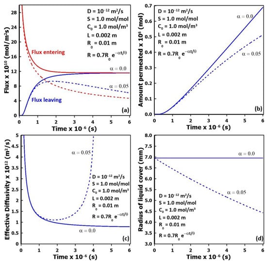 Previous results clearly show that with flooded cell experiments, the membrane diffusivity is estimated accurately, whereas, for partial liquid surface coverage, its estimation needs special attention. In addition, with partial coverage, the liquid coverage area may recede as a function of time because of permeant sorption and evaporation, thereby affecting the dynamic permeation rate. Indeed, the rate of recession of the liquid typically depends on the thickness of the liquid cover, the liquid surface tension, the rate of evaporation, and its diffusivity and solubility in the membrane. Figure 11 presents the comparison of the dynamic permeation results for an initial central circular liquid pattern for a 2 mm thick membrane. A series of simulations were performed with different exponential decays of the liquid coverage radius as expressed by Equation (13), with the radius R of the liquid cover decreasing from the initial liquid radius R0 as a function of a receding factor α, time t, and time lag θ. The results shown in Figure 11 were obtained with an initial radius of approximately 0.007 m and a receding factor of 0.05 chosen to examine a slowly receding liquid.