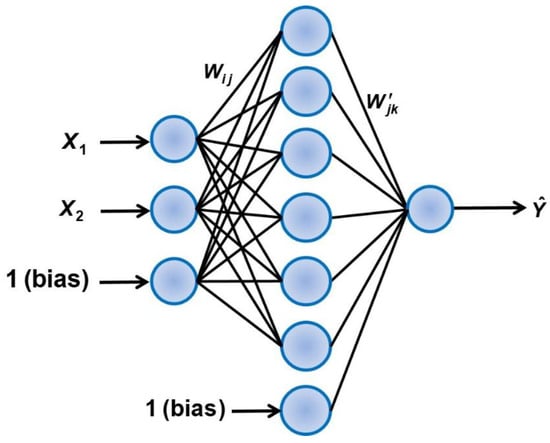 The scaled inputs of the first layer are fanned out to all functional neurons in the hidden layer. Each functional neuron in the hidden layer simply transforms the weighted sum of the inputs of the first layer through a nonlinear function to calculate its output. In this investigation, a sigmoid function was used as the nonlinear function Equation (A3). The weights between the neurons of the two adjacent layers are the parameters of the model. Each output Hj of the functional layer of the hidden layer is given by Equation (A4).