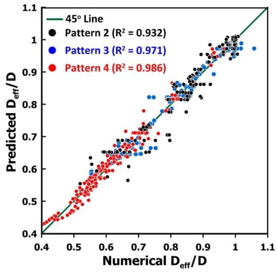 Parity plot of the prediction of the diffusion coefficient ratio Deff/D for three different liquid coverage patterns and the FFNN of Figure 12.