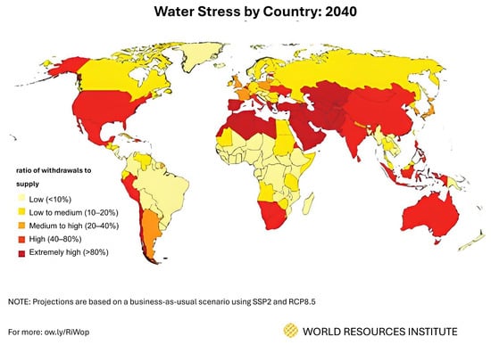 Population growth, industrialization, and the expansion of the industrial and agricultural sectors have led to a significant increase in global water consumption, as well as an annual acceleration in the release of pollutants into water sources [1]. Pollutants such as microplastics, pharmaceuticals, and radioactive elements [2,3,4] pose a serious threat to ecosystems and underscore the urgent need for effective water treatment and access to clean water. For example, Tania Montoto-Martínez et al. [5] report that 80% of all marine debris is plastic, and with the growing plastics industry, the amount of plastic debris could reach 12 billion tons by 2050 [6]. On the other hand, it is predicted that about one third of the world’s countries could face severe water shortages by 2040 (Figure 1) [7].