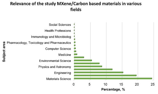 Graph of the relevance of MXene in different fields from 2015 to 2024, based on information from the Scopus database (accessed in May 2024) with keywords: MXene and carbon-based materials.