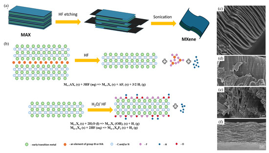 Scheme of MXene synthesis by HF etching and its morphology: (a) The scheme of MXene by etching with HF; (b) The synthesis and structure diagram of MXene; (c) SEM-image of Ti3C2 [78]; after washing with (d) distilled water; (e) ethanol; (f) MXene synthesized in situ [79].
