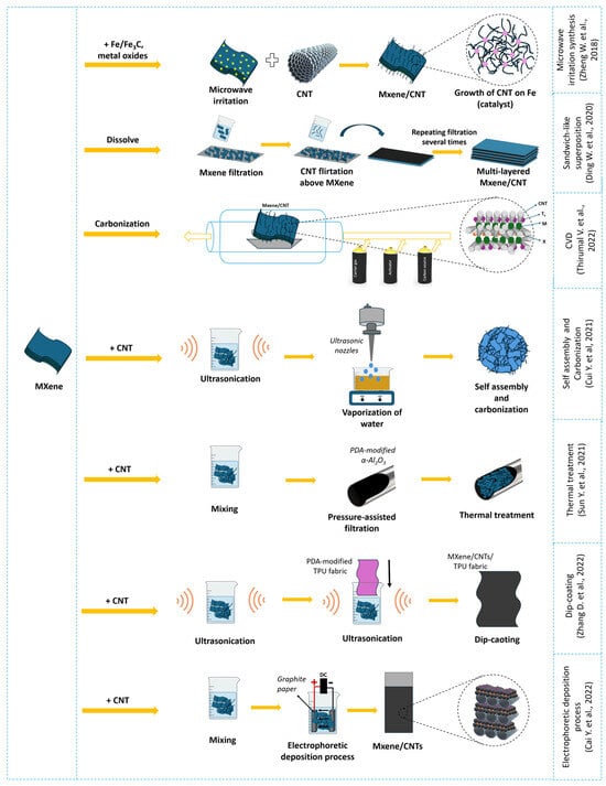MXene/CNT composite synthesis methods (adapted with permission from references on the right) [121,123,124,125,126,127,128].