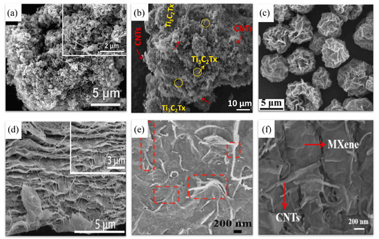Morphologies of MXene/CNT composites obtained by different methods: (a) Microwave irritation synthesis [124]; (b) CVD [123]; (c) Self-assembly and carbonization [125]; (d) Electrophoretic deposition process [126]; (e) Thermal treatment [127]; (f) Dip-coating [128].