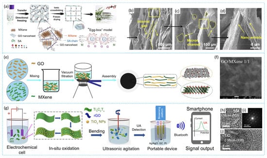 Methods for the synthesis of MXene/GO composites and corresponding results: Directional freeze drying and ion crosslinking for the synthesis of MXene/GO/SA composite (a) and SEM images of composite (b–d) [160]; vacuum filtration of MXene and GO (e) and SEM image of composite (f) [161]; in situ oxidation of MXene and ultrasonication with GO (g), TEM image (h) and HRTEM images of composite (i,j) [162].