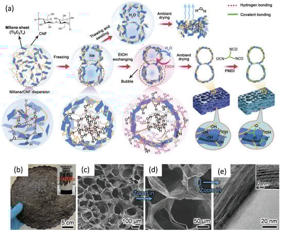 Wu N. et al. [168] developed the fabrication of MXene-based aerogels dried at ambient pressure (Figure 9). These aerogels are characterized by a large surface area, ultra-light weight, and high strength, thanks to the use of ultra-thin, high-strength, and renewable cellulose nanofibers (CeNFs) as highly efficient crosslinking materials for MXene nanosheets.