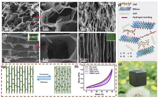 Ti3C2Tx-based biomimetic hybrid aerogels with oriented tracheid-like textures can also be prepared using a simple bidirectional freezing technique with the addition of CeNF and CNTs according to Xu T. et al. [169] (Figure 10). Curiously, the interwoven “mortars” of CeNF and CNTs bonded to MXene “bricks” of tracheid structure by synergistic electrostatic interaction and hydrogen bonding provide excellent interfacial bonding and superior mechanical strength. These aerogels exhibit compressibility of up to 80% and exceptional durability, withstanding 1000 cycles at 50% strain.