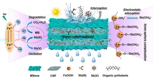 - Wan, K.; Fang, T.; Zhang, W.; Ren, G.; Tang, X.; Ding, Z.; Wang, Y.; Qi, P.; Liu, X. Enhanced Antimony Removal within Lamellar Nanoconfined Interspaces through a Self-Cleaning MXene@CNF@FeOOH Water Purification Membrane. Chem. Eng. J. 2023, 465, 143018. [Google Scholar] [CrossRef]