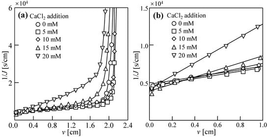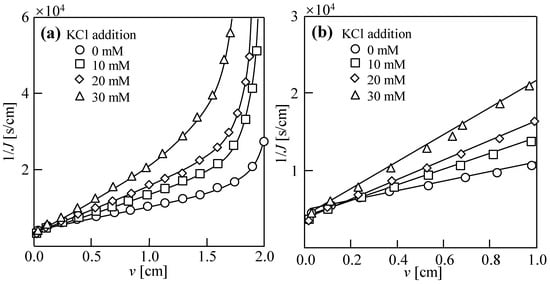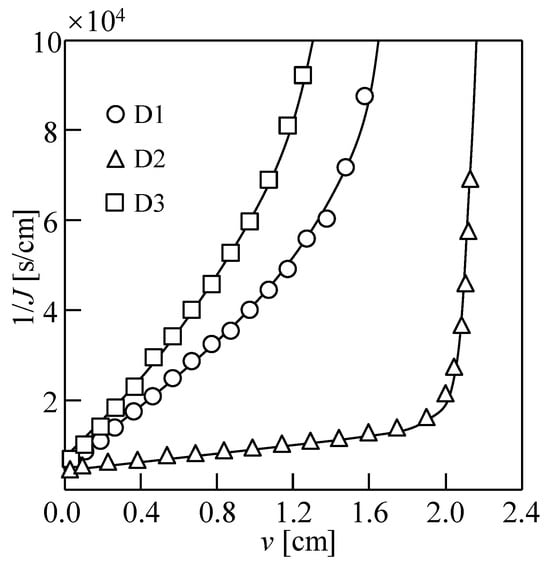 As shown in Figure 2b, Figure 3b and Figure 4b, the relationships between 1/J and v show linearity in the filtration stage and can be evaluated by [1]