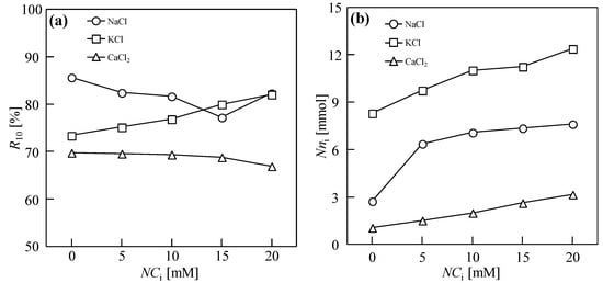 Sludge cake moisture content, R10 (a) and charge quantity of reverse cations diffusion, Nni (b) via 10 h dead-end forward osmosis for various types and concentrations of draw solutes. Herein, the abscissa is the total charge concentration, NCi, which is the product of the metal ion concentration (Ci) and the ion charge number (N); Nni is the product of the quantity of reverse cation diffusion (ni) and the ion charge number (N); the concentration of sludge, CFS = 18.75 g/L; cross-velocity on the draw side, u = 3.0 cm/s; concentration of draw solution, CDS = 1.0 M.