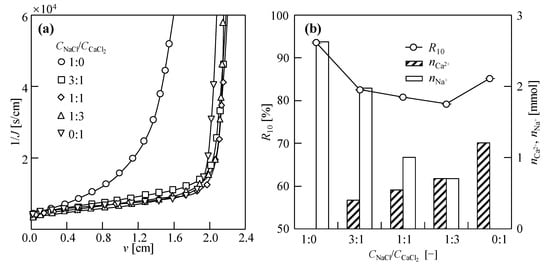 Figure 7a shows the dewatering behavior (1/J vs. v) when a variety of NaCl–CaCl2 binary solutions (1 M) were used as draw solutions. When v was the same, 1/J first decreased and then increased with an increasing CaCl2 proportion in the binary draw solutions. Compared to the single draw solution (1 M NaCl), the filtration rate of the NaCl–CaCl2 draw solutions significantly improved during the DEFO process. In the compression stage, compared with the single draw solution (1 M CaCl2), the filtration rate was higher for the NaCl–CaCl2 draw solution. The filtration rate of the sludge DEFO dewatering process was the highest when the concentration ratio of NaCl to CaCl2 in the binary draw solution was 1:3. The results showed that when CaCl2 was added to the NaCl solution as a binary draw solution, the osmotic pressure of the solution increased and the sludge dewatering rate increased significantly. Furthermore, the addition of NaCl to CaCl2 to derive the binary draw solution alleviated the phenomenon of membrane pore blockage caused by the reverse diffusion of CaCl2. The reverse diffusion of NaCl and CaCl2 improved the dewatering rate of sludge in DEFO.