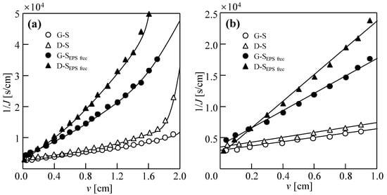 The EPSs in the excess sludge of the two WWTPs was removed, whereas the sludge concentration was maintained at 18.75 g/L for both G-SEPS free and D-SEPS free. The dewatering behaviors of four types of sludge in DEFO are shown in Figure 8. After removing the EPS from the same type of sludge, when v was the same, 1/J increased and the filtration rate decreased. This indicates that an EPS in the sludge improves the dewatering performance by promoting sludge flocculation; therefore, the dewatering efficiency of the sludge decreases after removing the EPS.