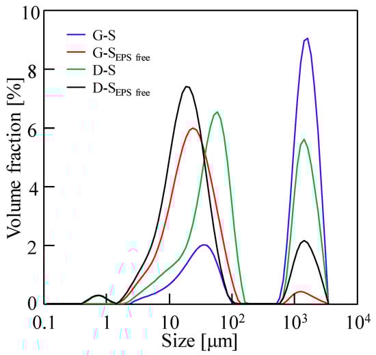 Typical particle size distributions of the initial sludge and the sludge without the EPS.