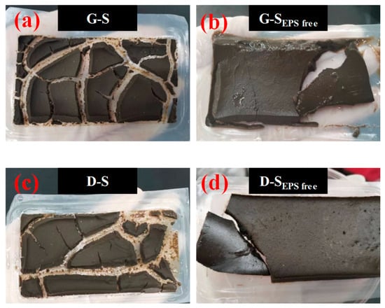 A previous study analyzed the morphology of filter cake and found that it presents a “dense top and loose bottom” structure during the progress of DEFO [1]. The water channel near the membrane surface helped water molecules flow from the sludge solution to the draw solution. However, a reduction in the sludge particle size may have led to the formation of a dense cake layer, which greatly increased the filtration RDEFO and deteriorated the dewatering performance of the excess sludge. Figure 11 shows the morphologies of the filter cakes after the four types of sludge were dehydrated. Regardless of whether G-SEPS free or D-SEPS free was used, the sludge after the removal of EPS formed a continuous, uncracked filter cake, as shown in Figure 11b,d. No water channels between the filter cake layers were found, and the filter cake near the FO membrane surface was very dense. This proved that the presence of EPS in the sludge played an important role in the formation of water channels in the cake layers.