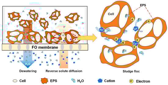 The RSD changes the properties of the feed solution. Studies have shown that the reverse diffusion of Na+ leads to a reduction in electrostatic repulsion between protein and polysaccharide molecules, which transforms the gel network into a filter cake layer and exacerbates membrane fouling [30,31]. Monovalent cations affect the structure of the cake layer by influencing the molecular chain structure of the substances [30,32]. By promoting the complexation and crosslinking of EPS, bivalent cations can affect the formation of the filter cake layer and aggravate membrane fouling. Furthermore, EPSs have stronger binding selectivity for Ca2+ than for Mg2+ and are more likely to form a stable gel network with Ca2+ [33,34,35]. In addition, metal ions can change the structure of EPS. Compared to polyvalent cations, monovalent cations can reduce the density of EPSs and easily affect sludge dewatering performance [36]. Conversely, RSD promotes substance recovery during FO and achieves an effective concentration and recovery of alginate substances through the reverse diffusion of Ca2+ in the FO process [37,38]. Xu et al. found that RSD can increase the salinity of a microalgae solution [39]. The application of an electric-field-assisted system helped improve the electrochemical efficiency and increased the recovery efficiency of lipids in the microalgae solution. Kekre et al. combined electro-assisted technology with the FO process and promoted the RSD of Mg2+ in the draw solution by applying an electric field, which not only improved the water recovery rate but also promoted the recovery of guanite [40].