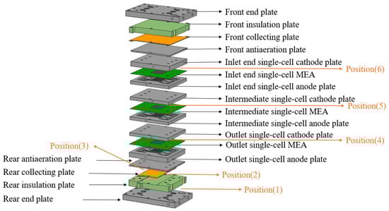 During testing, the thin-film sensors of the pressure distribution testing system were sequentially placed at the following positions: between the rear end plate and the rear insulation plate (Position 1); between the rear insulation plate and the rear collector plate (Position 2); between the rear collector plate and the rear antiaeration plate (Position 3); between the outlet single-cell MEA and the outlet single-cell cathode plate (Position 4); between the intermediate single-cell MEA and the intermediate single-cell cathode plate (Position 5); and between the inlet single-cell MEA and the inlet single-cell cathode plate (Position 6) for repeated pressure distribution testing. Each position was tested repeatedly to analyze the force distribution at each contact interface under different pressing forces. After repositioning the thin-film sensors, the assembly conditions of the stack were maintained consistently with those of the initial setup.