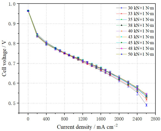 Stack performance was tested at different pressures, with the results shown in Figure 2. The pressure force and bolt tightening force are expressed as “kN + N∙m” in the following: for example, a stack assembled with a pressure force of 30 kN and a bolt tightening force of 1 N∙m is marked as 30 kN + 1 N∙m.