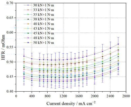 The HFR test results of the stack at different pressures are shown in Figure 3. The stack’s HFR gradually decreases with increasing pressing force due to the significant reduction in interface contact resistance. When the pressure force reaches 50 kN + 1 N∙m, the HFR at 1.0 A cm−2 is the lowest, at 0.434 mΩ, and similarly, the HFR at 2.0 A/cm2 is also the lowest, at 0.447 mΩ. However, it can also be observed that, with an increase in current density (great than 0.80 A cm−2), the HFR exhibits a slight increasing trend. This is because the gas flow required for the stack increases with the current density. Although the amount of water generated also increases, more water is carried away by the reaction gas, leading to a decrease in the PEM water content. This reduction in water content impairs the membrane’s proton conductivity, resulting in a corresponding increase in HFR.