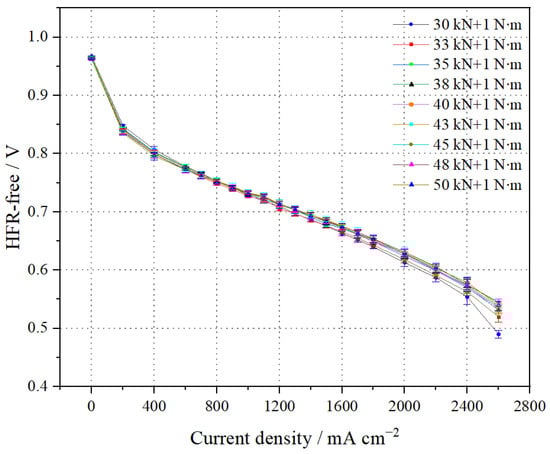 The stack polarization curves (HFR-free) at different pressure forces are shown in Figure 4. It can be seen that at 1.0 A cm−2, the average single-cell voltage (HFR-free) is 0.785 V when the pressure force is 43 kN + 1 N∙m, while at 2.0 A cm−2, it is 0.736 V. At 1.0 A cm−2, the average single-cell voltage (HFR-free) is 0.780 V when the pressure force is 50 kN + 1 N∙m, and it is 0.730 V at 2.0 A cm−2. The results indicate that, below a pressure force of 43 kN + 1 N·m, the average single-cell voltage (HFR-free) decreases with increasing pressure force. However, once the pressure force exceeds 43 kN + 1 N·m, the voltage begins to decline. This is due to the increased compression of the GDL, which can become embedded in the grooves of the bipolar plates and affect gas transport flux. Excessive compression of the GDL also reduces its gas transport capacity. Therefore, the optimal assembly force for the stack in this experiment is determined to be 43 kN + 1 N·m.
