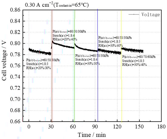 The sensitivity test results at 0.30 A cm−2 are illustrated in Figure 5. It can be seen that under the conditions of P(a/c/coolant) = 60/50/30 kPa, the stack performance improves with increases in RHc and Stoich(c), and the stack performance is highest under the conditions of RHc = 40% and Stoich(c) = 4. When P(a/c/coolant) = 60/50/30 kPa, and the RHa increases to 30%, there is no significant improvement in stack performance.